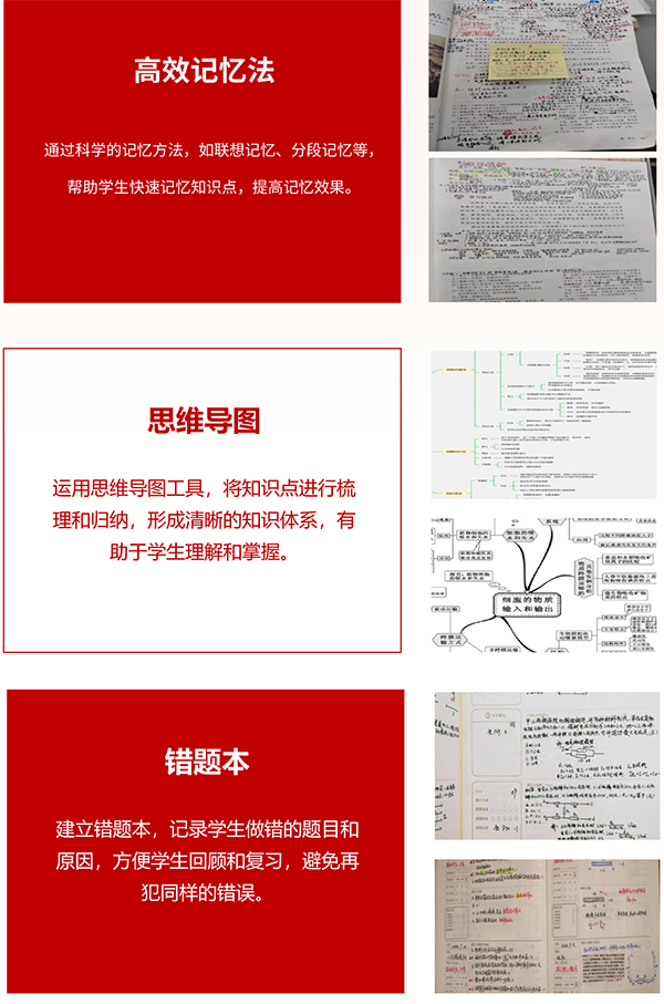 指导学生学会预习阅读,学会专注听讲,学会整理消化,学会积累运用。指导学生做“课堂笔记”,做“纠错本”,做“重难点例题本”,这三本就是学生复习时的个性资料。