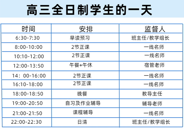 每班一个班主任,每个班主任只负责一个班,从6:30-22:30全程跟踪,与学生同吃同住;