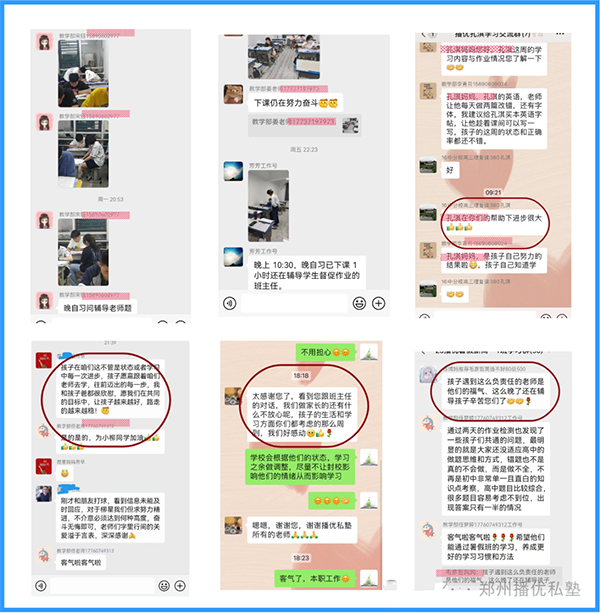 每个学生定制科学合理的学习方案,建立学习交流群,每次考试成绩、日常学习及生活情况都会及时反馈到群里,让家长随时了解孩子的学习进步情况。定期召开家长会及家庭教育公益讲座,与家长沟通关于孩子的学习问题,实现家校合一,高效解决学生学习问题。