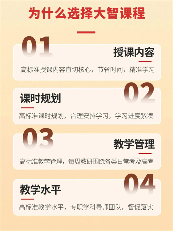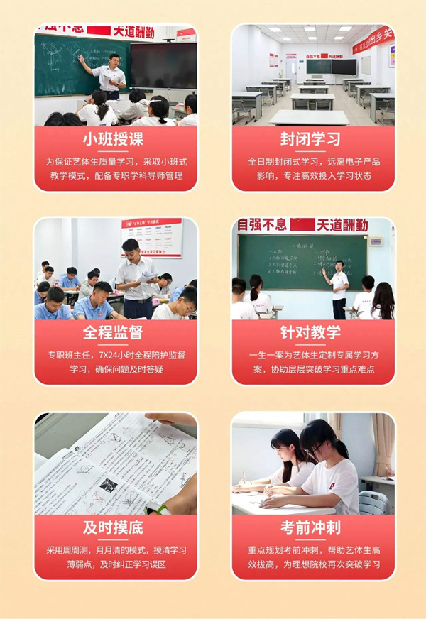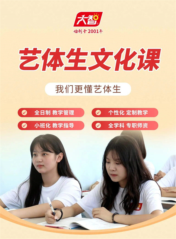 济南大智教育专注艺体生文化课的优势1、授课内容:高标准授课内容直切核心,节省时间,精准学习;2、课时规划:高标准课时规划,合理安排学习,学习进度紧凑;3、教学管理:高标准教学管理,每周教研围绕各类日常考及高考;4、教学水平:高标准教学水平,专职学科导师团队,督促落实。