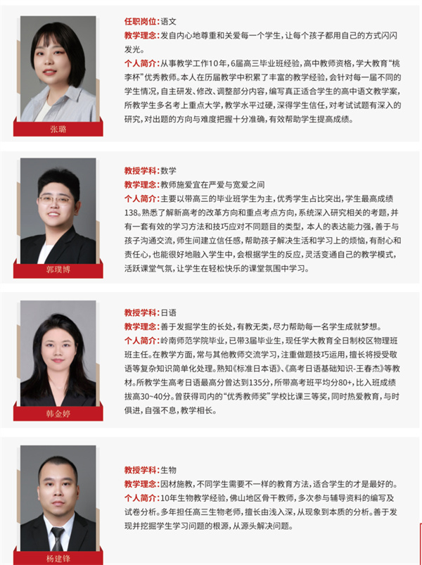 他们常年战斗在高考复读的一线战场,比一般老师更熟悉复读生的学习情况和心理状态,对高考复习冲刺有一套成熟的方法论,能更有效帮助学生提升成绩考取理想学校。