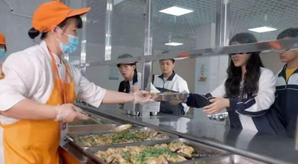 学生在食堂打饭,每天的菜品新鲜,由华青外聘的大厨精心烹饪,深受学生喜欢