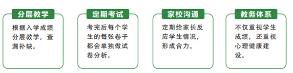 | 重点中班(25 人左右) | 教学校长领衔核心直管教学 6年以上教学经验教师 按文化课成绩分层教学 针对偏科的同学,分配成学习小组 实行互帮互助,共同进步 |
