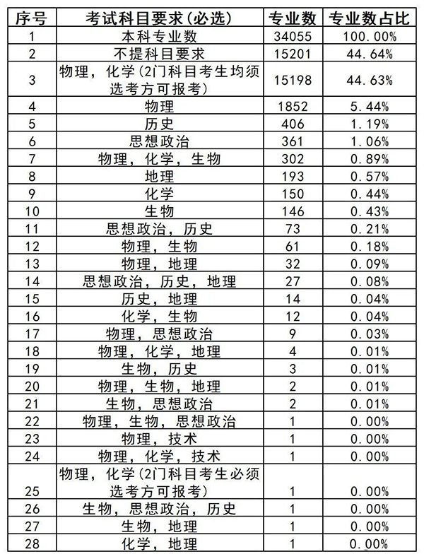 选考科目要求分为4类:1科、2科、3科或不提。选择1科的专业,表示考生必须选考该科目;选择2科或3科的专业,表示考生必须同时选考规定的2科或3科;未提出科目要求的,表示考生可选考任意3科。