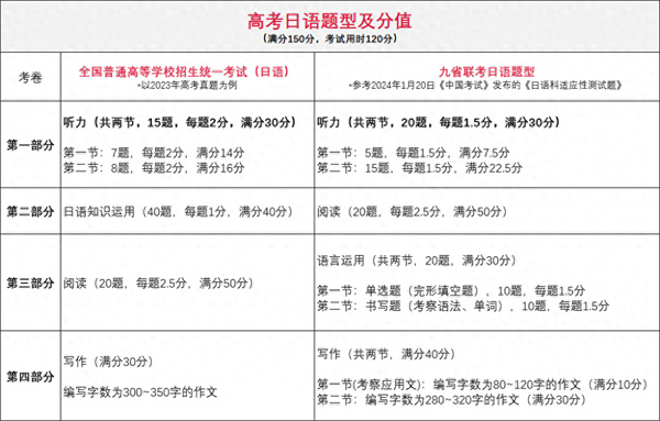与全国普通高等学校招生统一考试(日语)2023年的真题(以下均简称为“旧考卷”)结构相比,日语科适应性测试题(以下均简称为“新考卷”),总整体来看,新考卷与旧考卷相同的是:都分为四个部分进行考察,满分150分,考试用时120分。但旧考卷的四个部分分别为:听力、日语知识运用、阅读、写作,新考卷的四个板块分别为:听力、阅读、语言运用、写作,也就是说新考卷将日语知识运用更改为语言运用,依然保留听力、阅读、写作这三个部分。此外,新考卷的每个板块都发生了不少变化。