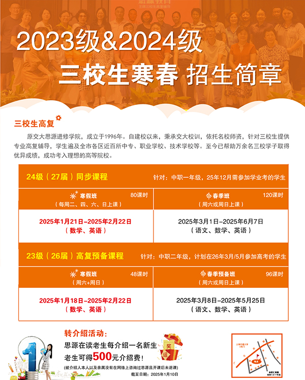 原交大思源进修学院,成立于1996年。自建校以来,秉承饮水思源、笃行致远、以身立教、以德树人的校训,依托名校师资,针对三校生提供专业高复辅导,学生遍及全市各区近百所中专、职业学校、技术学校等。至今已帮助两万余名三校学子取得优异成绩,成功考入理想的高等院校。