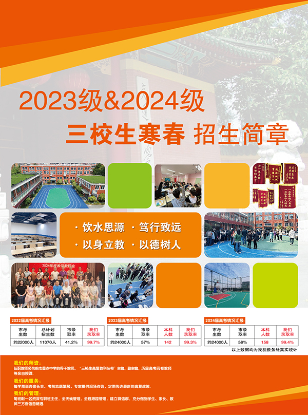 传承百年名校菁华,具有近30年的高复办学经验,任职老师多为市重点中学的骨干教师和“三校生高复教课丛书”主编、副主编。近几来年我校高复班高考上线率约为98%以上,本科录取人数、单科满分人数、总招生人数,总录取人数在业内均处于领先水平。