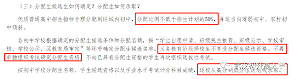 首先是官方发布的《武汉市推进高中阶段学校考试招生制度改革的实施方案(试行)》的政策解读,文件中关于分配生的确定和录取是这样说的: